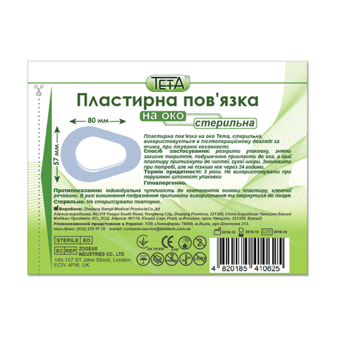 Пластирна пов'язка на око Тета стерильна використовується у період післяопераційного догляду за очима, а також при косоокості. Спеціально розроблена форма даного пластиру характеризується естетичним виглядом.